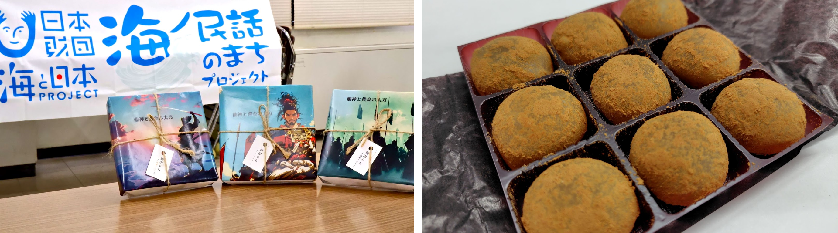 最後に、海ノ民話アニメーションとのコラボ菓子を開発した、鎌倉市腰越地域で和菓子を作る「菓子屋中島」店主の中島隼人さんが登壇。新田義貞の勇ましい姿をパッケージに採用した「新田もち」を紹介いただきました。その場で試食をした沼田監督からは、「きな粉の上品な甘さがとてもおいしい」との声が。また、参加した児童全員にも、「新田もち」をプレゼント。このお菓子は今後改良を加え、「黒糖きな粉味」「ごまぐるみ味」「ショコラ味」の3つのラインナップで2月上旬に発売予定です。