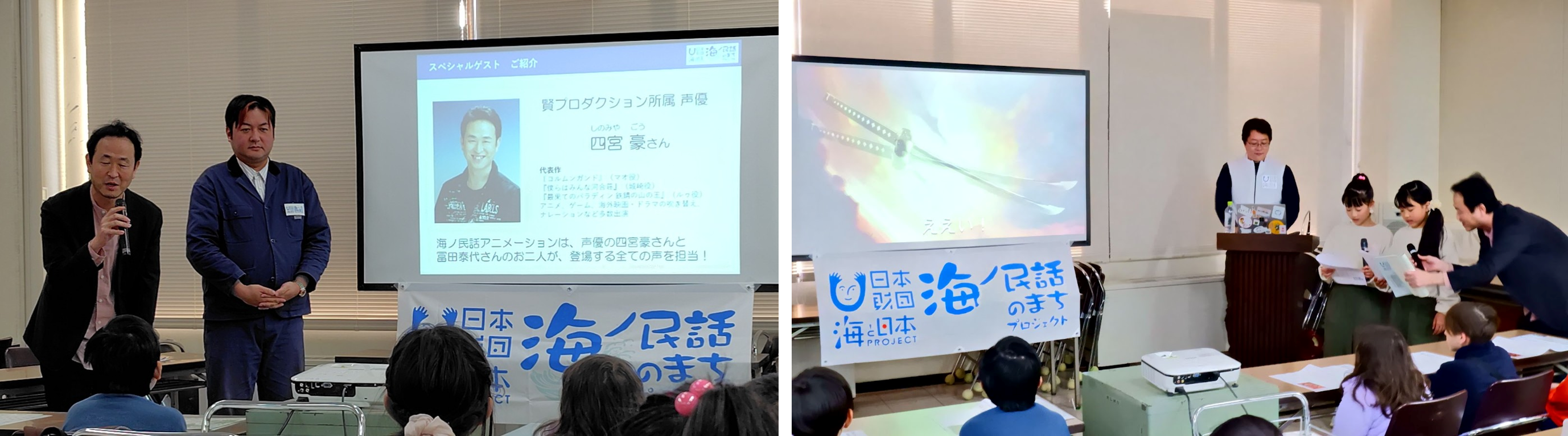 | プログラム | ■アニメ上映 ・海と日本プロジェクト「海ノ民話のまちプロジェクト」概要説明 ・海ノ民話アニメーション「龍神と黄金の太刀」上映 ■海ノ民話の授業 講師:鎌倉市図書館 河合真帆 氏 授業タイトル:新田義貞と稲村ヶ崎の海について ■声優体験 ゲスト:海ノ民話アニメーション監督 沼田心之介 氏 ゲスト:海ノ民話アニメーション声優 四宮豪 氏 ・沼田監督によるアニメの制作解説 ・四宮氏によるアニメの声優実演披露 ・参加児童の声優体験 ■コラボ菓子の紹介 協力:菓子屋中島 中島隼人 氏 ・「龍神と黄金の太刀」コラボ菓子のお披露目 |