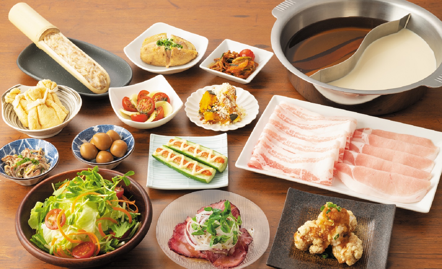 ●内容:三元豚食べ放題コース、温野菜食べ放題コース、たんしゃぶ食べ放題コース、梅たんしゃぶ食べ放題コー ス、梅たんしゃぶ・厳選牛食べ放題コースが中高生は平日半額、休日税込500円引き