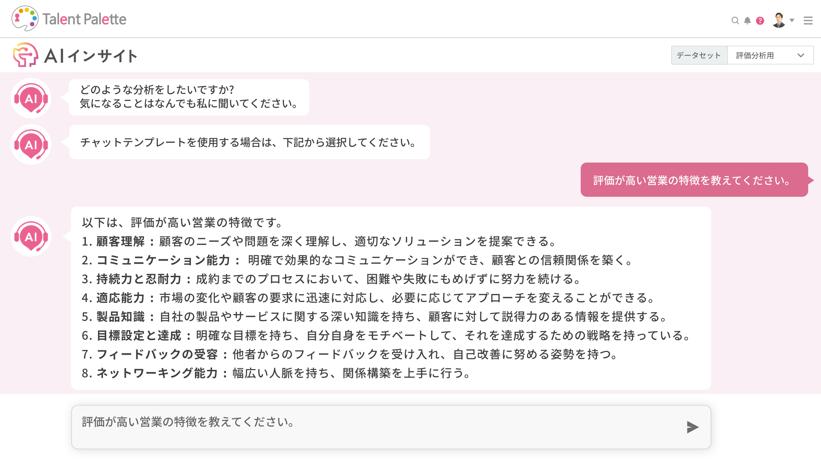 タレントAIインサイト機能は、「営業部門で評価が高い社員の特徴を教えてください」といった自由文章による対話形式で、社員の特徴から該当する社員を抽出することができます。