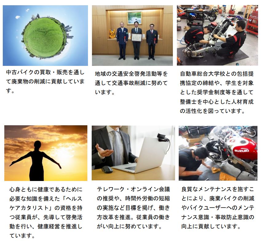 ①中古バイクの買取・販売による廃棄物削減、良質なメンテナンスや啓発活動による交通事故削減への貢献