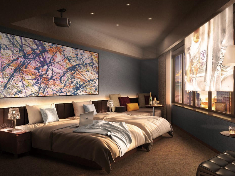 また、躍動感あふれる銀座コリドー街に佇むホテルの客室として「昼夜を問わず充実した時間を過ごせる場所」「そこでしか出来ない体験をする場所」であるべく、全室に高音質(*1)スピーカーとプロジェクターを完備。くつろぎとエンターテインメントなコンテンツが生み出す新たなコントラストの中で、音楽や映像、光に酔いしれながら自分だけの充実した時間を過ごせる場所をご提供いたします。