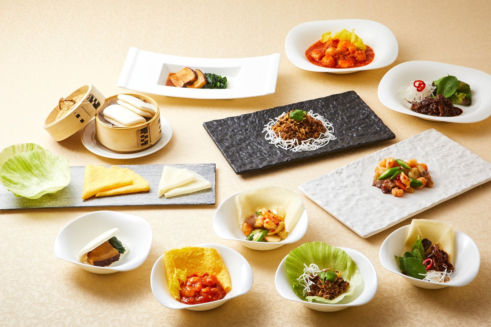 王道の蒸しパンで包む“もち豚の角煮”をはじめ、ヤングコーンやアスパラ、赤ピーマンなどと彩りよく仕上げた食感の良さも魅力の“海老のXO醤炒め”を中華クレープで巻いて、しっかりした味付けで仕上げた“牛肉の甘辛味噌炒め”を晒し葱やベビーリーフと合わせて、レタスカップや中華クレープで包んで、など新しい中国料理の楽しみ方をご提供します。