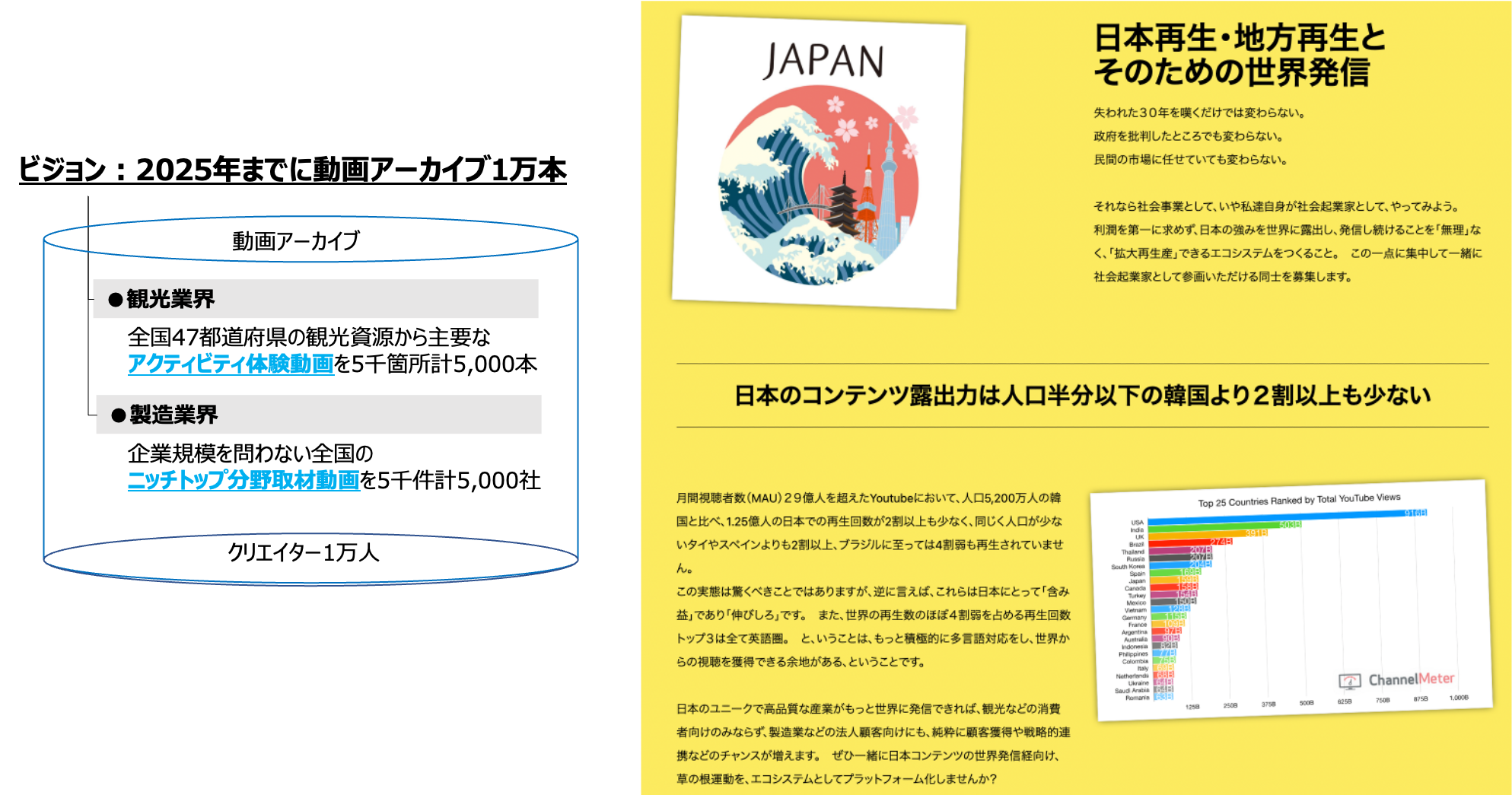 具体的には、日本各地の観光資源や製造業、特に日本が高い世界シェアを獲得している当該産業はもちろん、シェアは低いものの、世界でも差別化された製品やサービスを提供する業界や組織そして地域に関する良質なコンテンツの発信を世界に向けて、無理なく拡大再生産させた1万本の動画アーカイブを2025年までにつくること、そしてそのために重要な役割を果たすことができる1,000人のクリエイターネットワークを醸成することを目的としています。