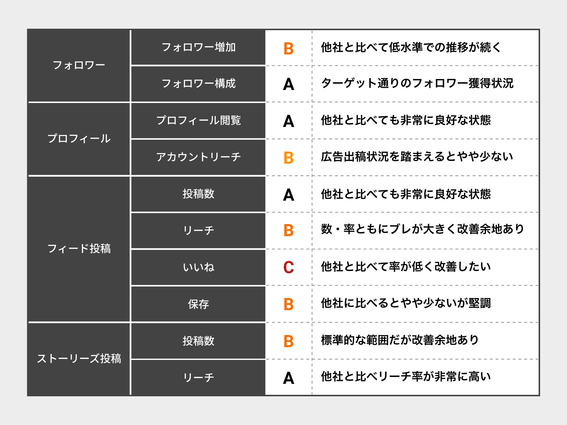 当社独自の10の評価指標に基づき3段階で判定します。10の評価指標は、2015年の創業以来培ってきた運用支援やアカウント分析の知見から企業のアカウント運用において特に重要だと定義する独自の項目です。さらに、この指標をA/B/Cの3段階で評価することで具体的な改善策やネクストアクションを提案することができます。