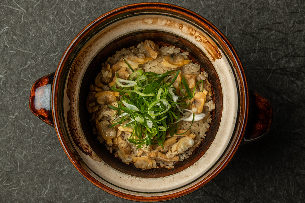 日本人に最も親しまれ馴染み深い貝である浅利。その出汁で米を炊き上げ、京野菜として知られる青葱・九条葱をあしらいました。滋味深い味わいの浅利ご飯に、葉の甘みが特徴の九条葱がアクセントを加えます。