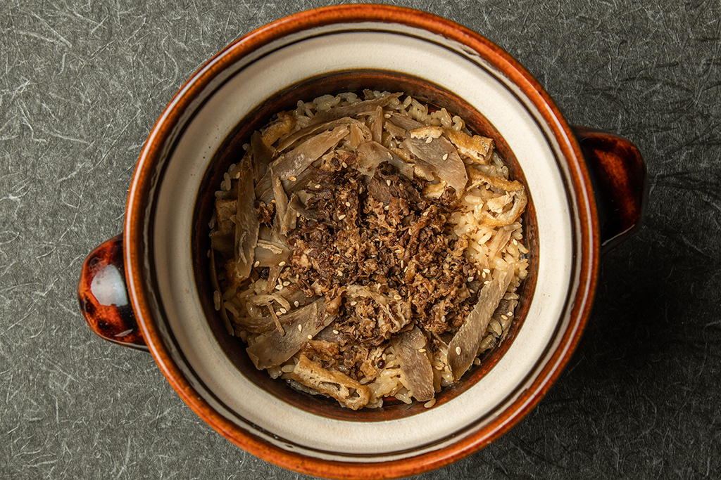 生姜を使って濃く甘辛く具材を煮付ける時雨煮は、いわずもがなの❝ご飯泥棒❞。良質な国産牛肉の旨みと牛蒡の旨みがしっかりと合わさり、ご飯だけでなく、お酒も今ひとたび進んでしまいそうな〆ご飯です。