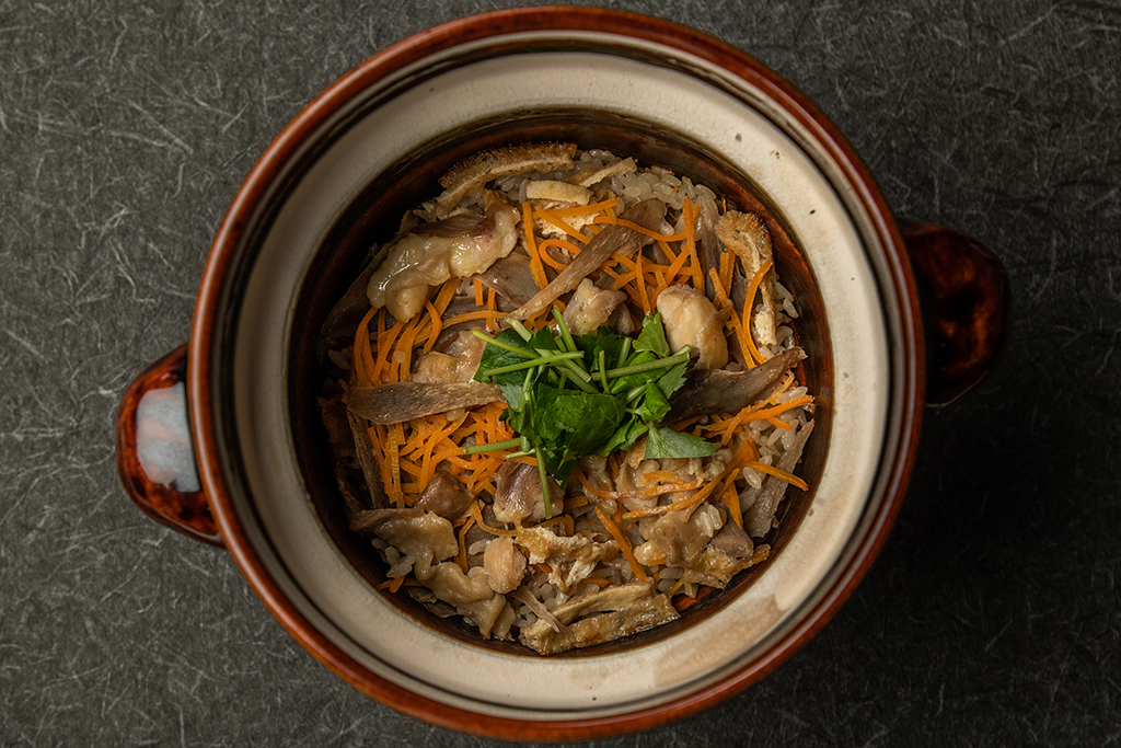 岩手県の冷涼な気候と無農薬の飼料で丁寧に育てられた「いわい鶏」。東京ではまだまだ知られていないこの銘柄鶏を、炊き込みご飯の中でもポピュラーな“鶏牛蒡ご飯”に仕立てました。親しみ慣れた味だからこそ、素材の違いが味の決め手となります。