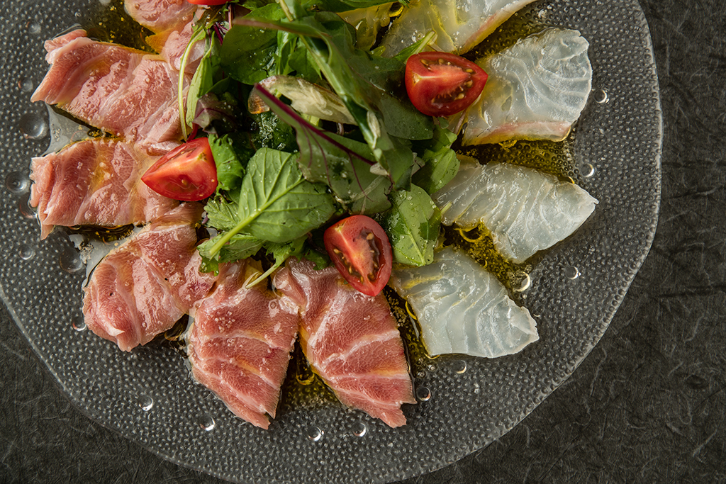 ■名物 小さなおかず三種盛り合わせ 1,100円 ■本鮪と瀬戸内産真鯛のカルパッチョ 1,680円