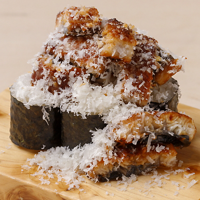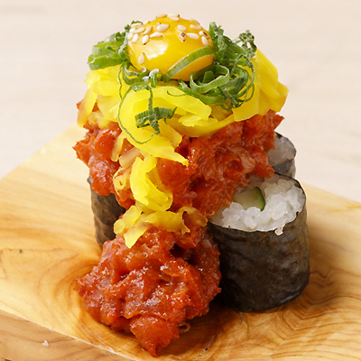 豆板醬、一味唐辛子、辣油の3種の辛味とたくわんの甘酸っぱさが不思議と調和する新感覚寿司。