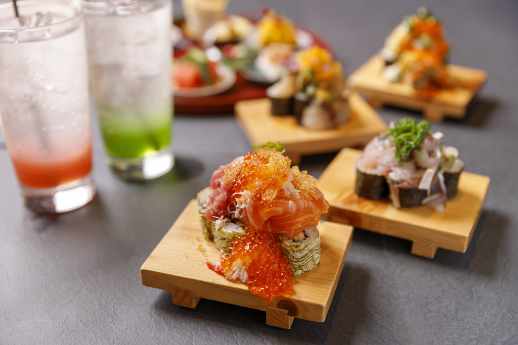 「京町恋しぐれ 新宿 本館」の新しい主役は、11種の「あて巻き」。お酒の❝アテ❞になるようにと、新鮮魚介を中心に、様々な素材や薬味を巧みに掛け合わせて作られたオリジナリティ溢れるお寿司の数々は、まるで京都のシンボルでもある舞妓さんの着物のように艶やかで、嫋やかさかささえも感じる顔ぶれ。写真映えも申し分ありません。目と舌で、都の華やぎをお楽しみください。