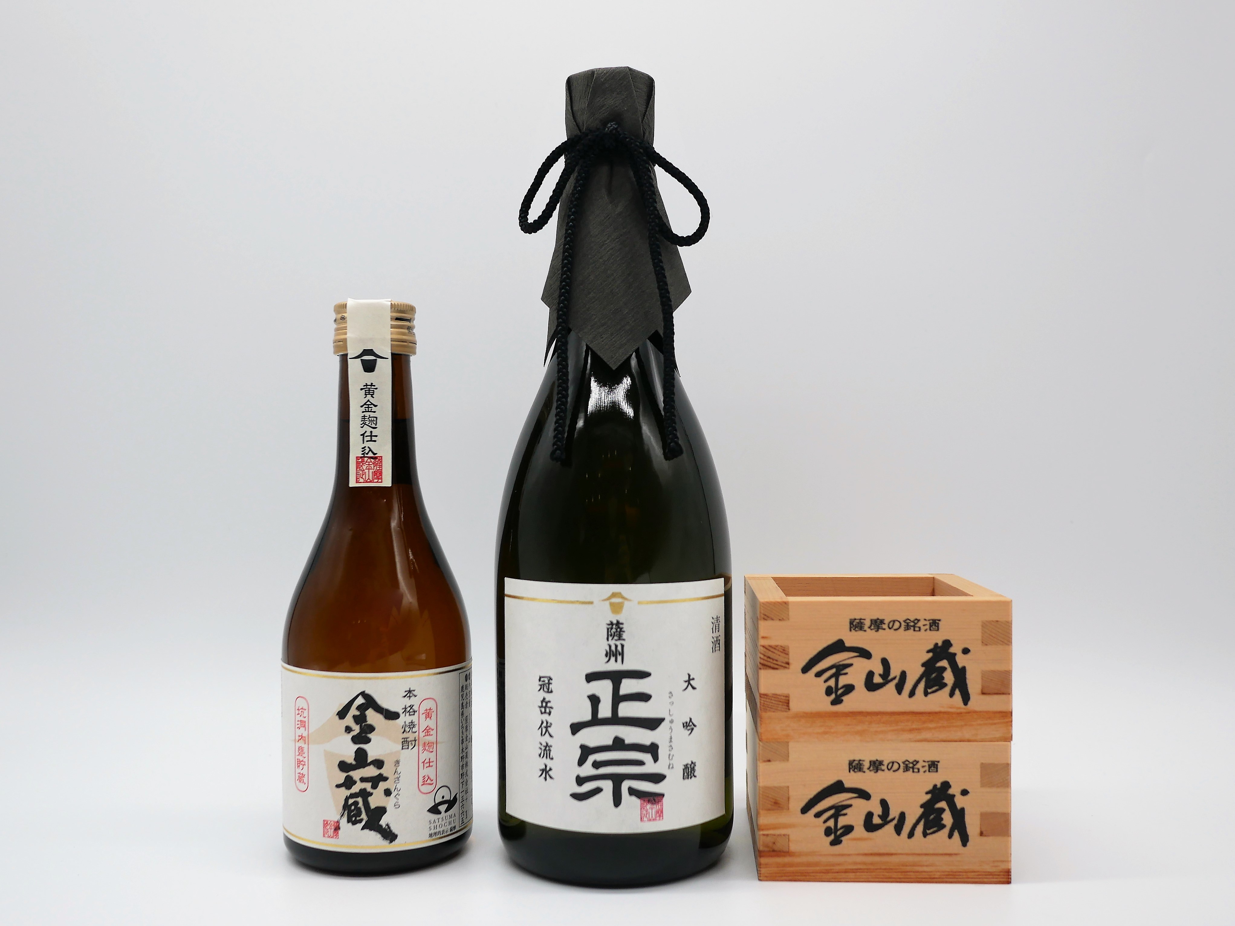清酒「薩州正宗 大吟醸酒720ml」と本格芋焼酎「金山蔵坑洞内甕貯蔵 300ml」、薩摩金山蔵オリジナル枡をセットにしました。枡が2つで「枡枡」=「ますます」ニコニコで過ごしてもらいたい!敬老の日のプレゼントにもおすすめです。