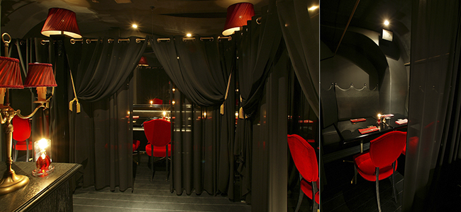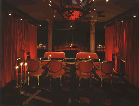 紅く厚いベルベットカーテンで仕切れらたL字型のシート。