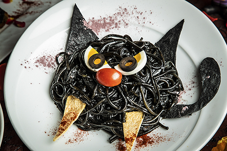 長年ハロウィンシーズンのアイドルとして活躍してきた黒猫ちゃんが、今年はヤンチャに大暴れ!牙を剥き出し、目は闇に爛々と光り輝く…その変貌ぶりに驚いたとしても怯まなくて大丈夫。何故ならその正体は館秘伝の美味なる漆黒のソースを纏ったパスタだから。スモークサーモンの塩気との相性も抜群です。