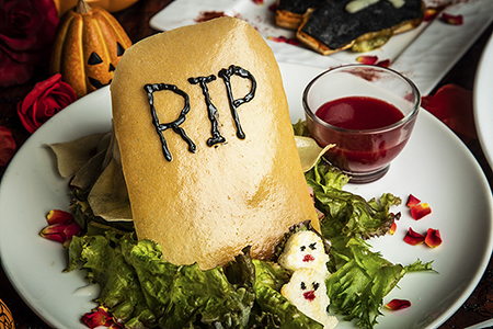 モンスターの魂を呼び覚ます復活の儀式 〜ベーコンとくるみのサラダ フレンチドレッシングとベリーのドレッシング〜 死したた野菜を呪文によって甦らせる館の名物サラダが、ハロウィン仕様にお召し替え!「闇の墓場に」と唱えられたら「生贄の血を」、「我らに魔力を」の言葉には「与え給え」とお応えください。墓場にベリードレッシングの❝血❞を捧げ、隠れたモンスターたちの魂を解き放ったら、美味しいサラダの完成です。
