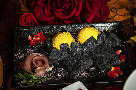 辺りを伺い知ることさえできぬ闇の中から突然、夜空で煌々と光る月へと羽ばたいていく蝙蝠をモチーフにした祭りの始まりを告げる前菜。竹炭を練り込んだほんのり甘い手作りのフォカッチャとかぼちゃ香るクリームチーズ、脇でひっそりと咲く館の主人を表した生ハムの薔薇の塩気の三位一体で食欲を揺り起こします。