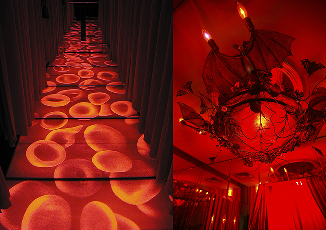 「魔除の十字架」が埋め込まれたフロントスペースに迎えられ進んでいくと、紅いベルベットのカーテンに取り囲まれ、赤血球が浮かび上がる廊下が伸びています。通り抜けた先に棺桶が中央に鎮座する広間が出現…!