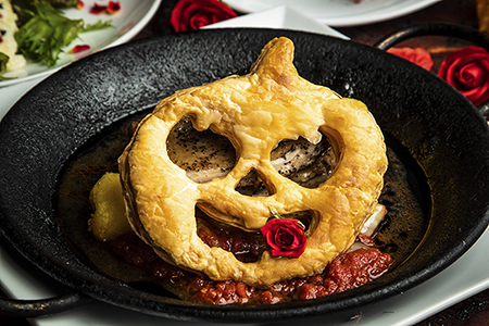 無謀にも伯爵に反逆し、無残に火炙りとなっていく鶏たち。その葬いに、提灯頭のジャック・オー・ランタンが一役買ったようです。数種のハーブで漬け込んだ鶏もも肉をトマトでじっくり煮込み、酸味と甘みが絡み合う複雑な香味を纏わせました。寄り添うかぼちゃ頭のサクサクパイと合わせてお召し上がりください。