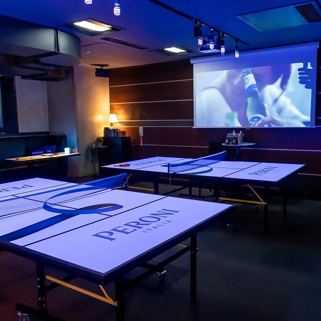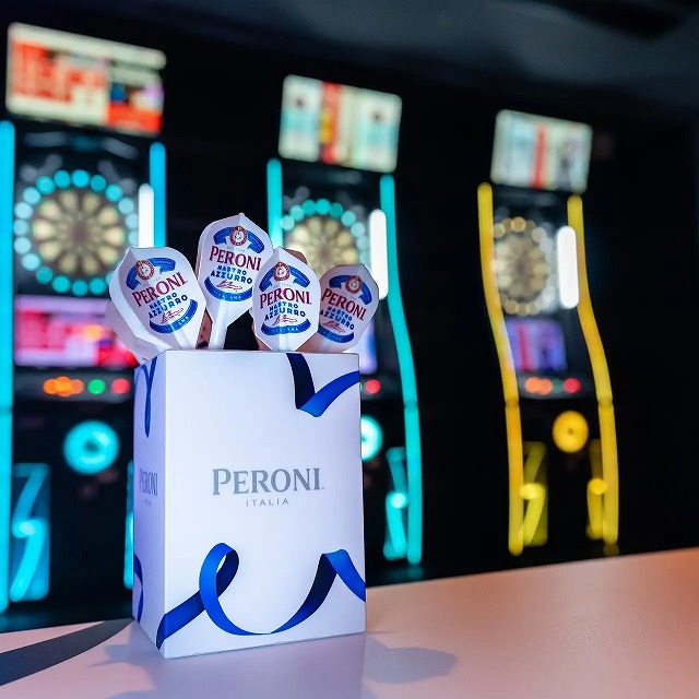 10月より「バネバグース宮益坂店」はプレミアムイタリアンビール『ペロー二 ナストロアズーロ』の旗艦店として期間限定でコラボレーションいたします。『ナストロアズーロ』とはイタリア語で『青いリボン』という意味ですが、期間中店内は爽やかな風にのって青いリボンが舞うイメージに包まれ、『ペローニ ナストロアズーロ』一色に。吹き抜けから見下ろすペローニ特設ビリヤードや筐体がペローニで統一されたダーツ機など、圧巻のロケーションが体験いただけます。
