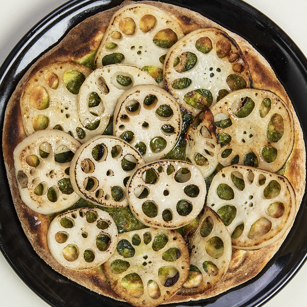 瑞々しい新レンコンの食感が心地よいオリジナルピザ。爽やかな大葉のジェノベーゼソースが、レンコンの持ち味をより引き出しています。