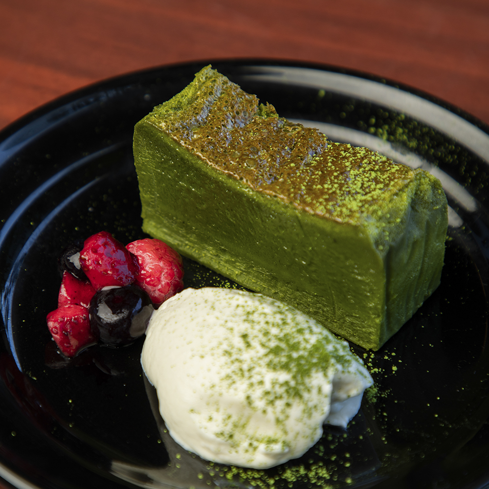 チョコレートテリーヌの中に抹茶をたっぷりと練り込んだ濃厚な味わいのデザート。珈琲にも紅茶にも、不思議と良く合います。