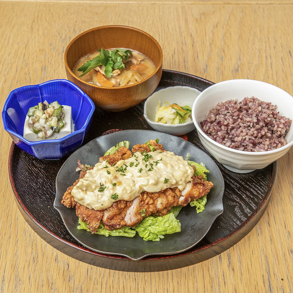 ざっくりつぶした半熟玉子を混ぜ込んだタルタルソースと甘酢の風味が効いたチキン南蛮の相性は抜群。人気No.1orNo.2を争うランチ定食です。