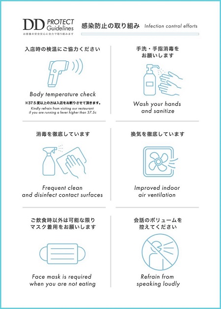ダイヤモンドダイニングが運営する各店舗では、お客様に安心してお食事を楽しんでいただくため、行政が定める方針に基づいた感染防止対策を最大限に講じ「DD PROTECT Guidelines」として実施しております。