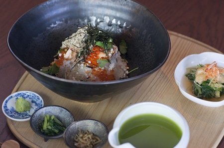 きりっと渋みが効いた宇治抹茶と、滋味深く香り豊かな鰹出汁が極上のハーモニーを奏でる逸品。新鮮な鮭といくら、甘辛い味つけに虜になる鰻蒲焼き。いずれも意外なほど抹茶と相性が良く、身体と心をほっと寛がせてくれる味わいです。お好みの銘柄の宇治茶もお楽しみいただけるセットメニューもご用意しています(+440円)。