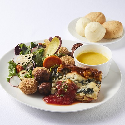 特製のヨーグルトアイスジュレで召し上がっていただくサラダ、ほうれん草とかぼちゃのラザニア、チーズリゾットのライスコロッケ、大豆ミートボール、かぼちゃのポタージュスープがセットになった、お野菜たっぷりで栄養バランスも◎のシェアプレートです。