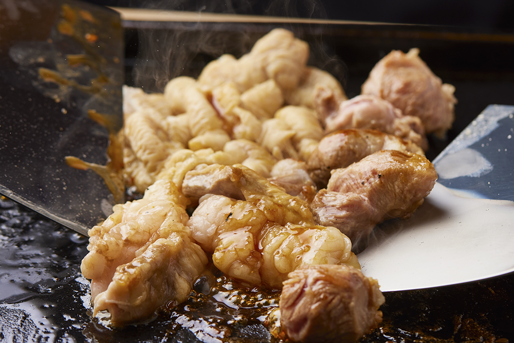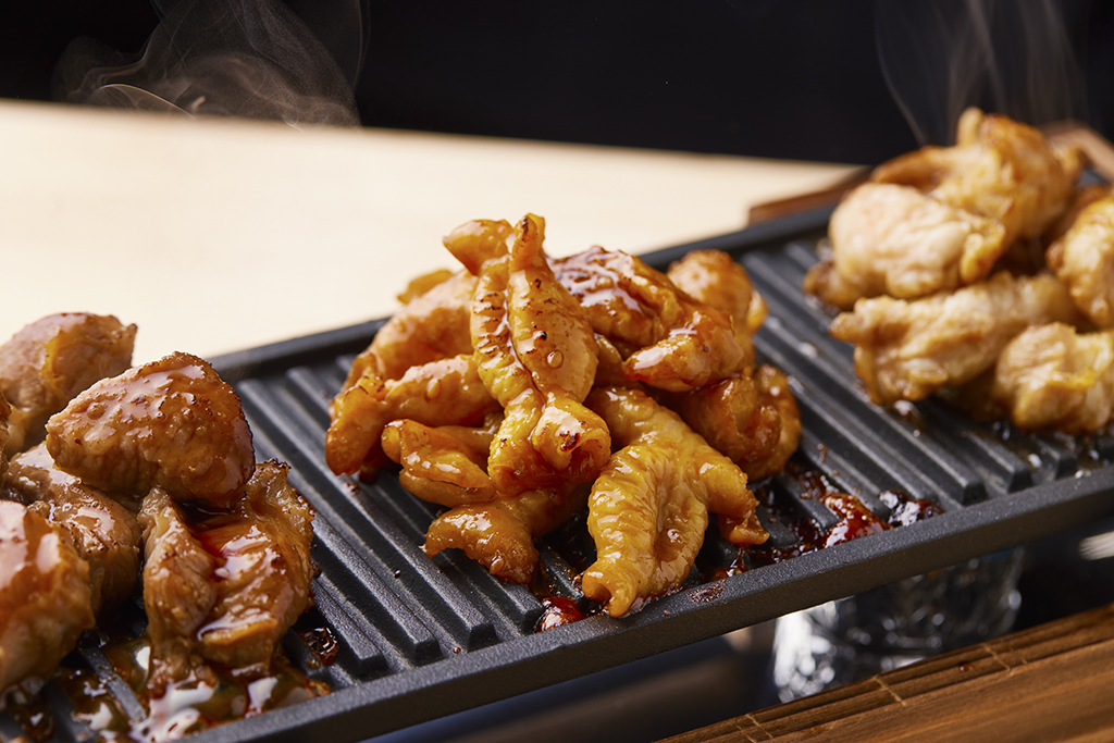 熱した鉄板でご提供することで、お酒と合わせながらゆっくりと、アツアツのお肉を楽しんでいただくことができます。あっさりした「塩ダレ」、コクのある「醤油ダレ」、こってり味の「味噌ダレ」の3種のソースから、お好みの味つけでお召し上がりください。