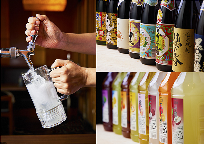 種類の多さに留まらず、全テーブル設置のサーバーから自由に注げるレモンサワーや、好きな濃さでサワーやカクテルが作れるセルフドリンクバー、視覚的にも楽しいトルネードビールなど、エンターテインメント要素も満載です。