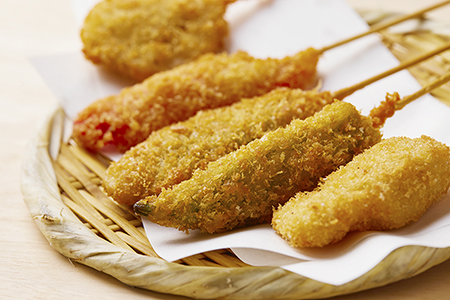 さらに、大阪ご当地グルメの代表格・串カツもラインナップ。肉、野菜、魚介と、さまざまな具材をカラッと揚げた❝揚げもん❞は、意外にも口当たりが軽く、何本でも食べられてしまう、最強のおつまみです。