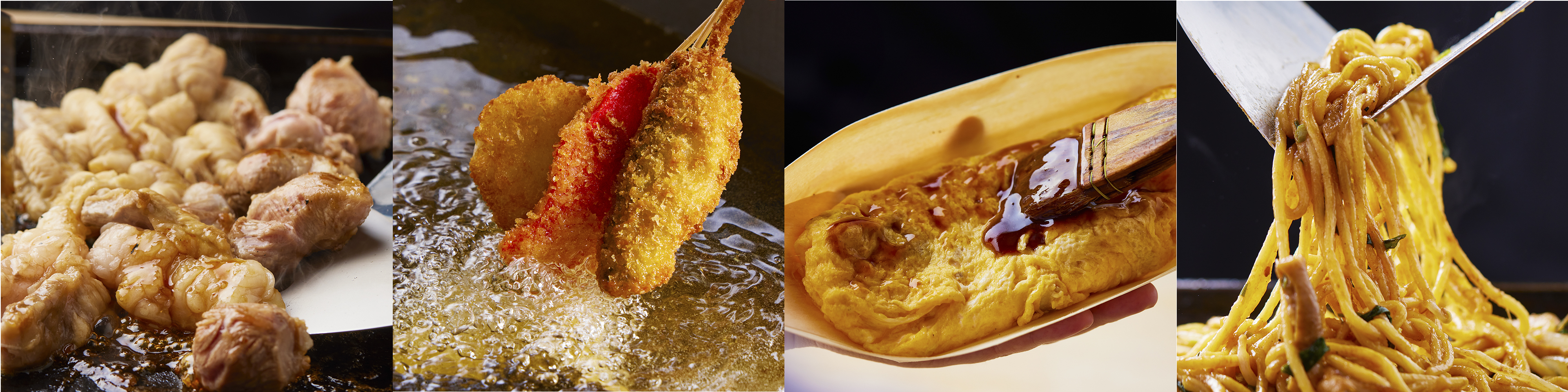 串に刺さず熱々の鉄板でご提供する「焼きとん」と「焼き鳥」や、関西ではお祭りとあれば当たり前のように軒先に並ぶ、コスパ良過ぎる屋台B級グルメなど、濃くって、脂っこくて、塩気も効いていて…ちょっぴり罪悪感を憶えてしまっても、お酒をますます美味しく楽しめる、そんなメニューを取り揃えています。