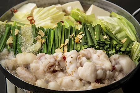 さっぱりとしながらも旨みが深い鶏出汁の中に、新鮮な上に大粒で上質な、国産牛もつがたっぷり!新鮮ゆえにぷりっぷりな食感、野菜と醸し出す絶妙な味のハーモニー…季節問わず食べたくなる鍋の王様です。