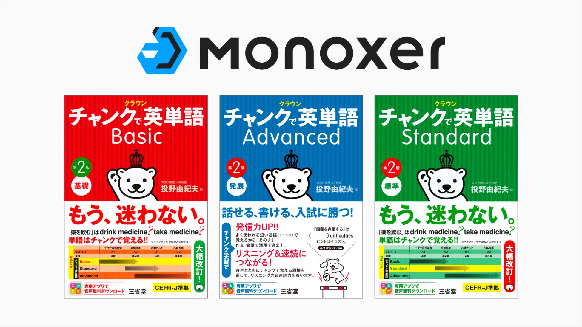 モノグサ株式会社(東京都千代田区 代表取締役:竹内孝太朗、畔柳圭佑)は記憶定着のための学習プラットフォーム「Monoxer(モノグサ)」が、株式会社三省堂(東京都千代田区 代表取締役社長:瀧本多加志、以下三省堂)よりライセンスを受け、Monoxer上で『クラウン チャンクで英単語』Basic、Standard、Advancedの3つの対応レベルを導入教室に向けて2023年度にリリースすることをお知らせいたします。