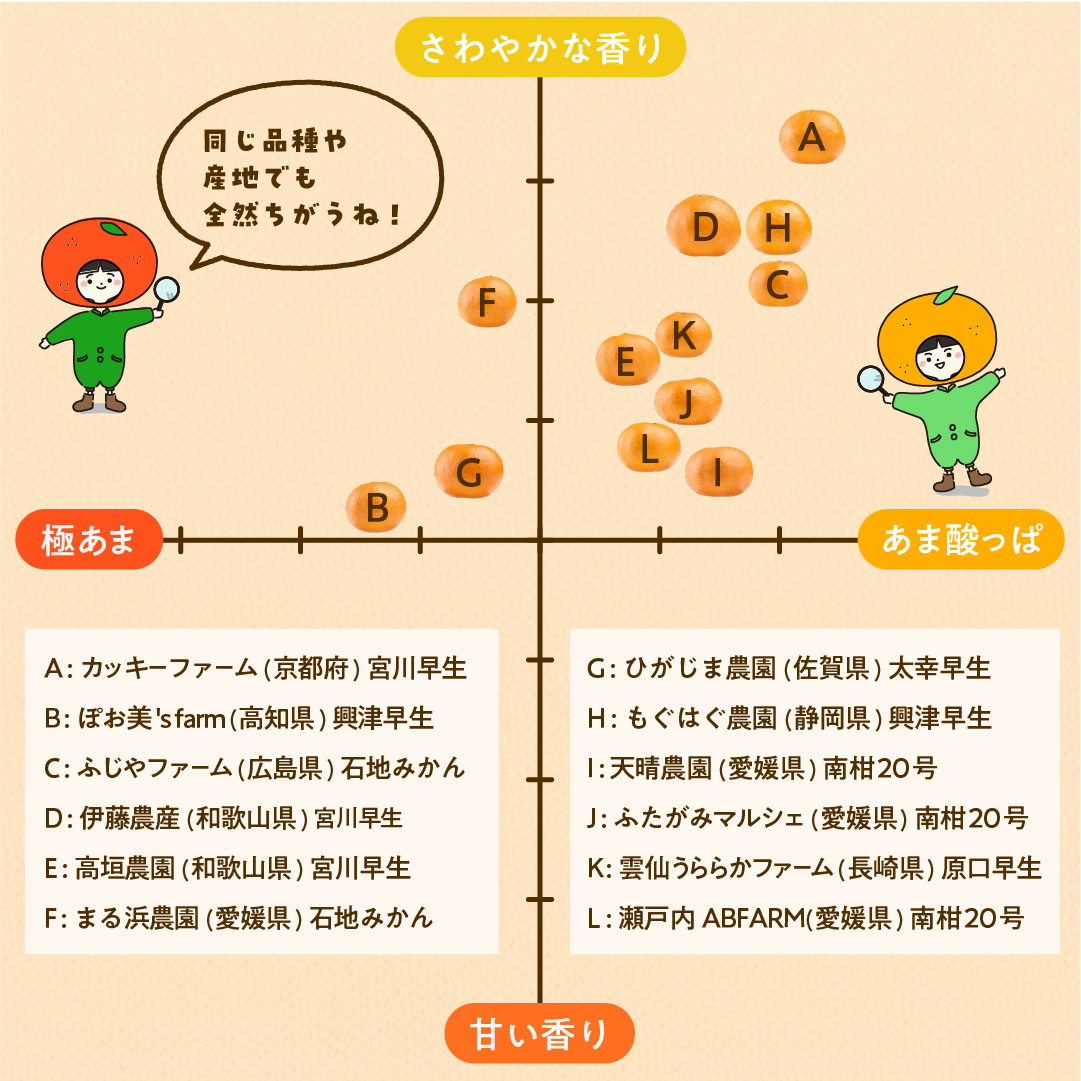 東大みかん愛好会メンバーへのアンケートの結果をもとにチャートを作成しました。甘さだけでなく口に入れる前や入れた後に広がる香りの違いにも注目し、味と香りの2つの軸で作成しています。同じ産地や品種でも異なる分布となり、それぞれの生産者のもとで個性豊かに育てられていることがわかる結果となりました。