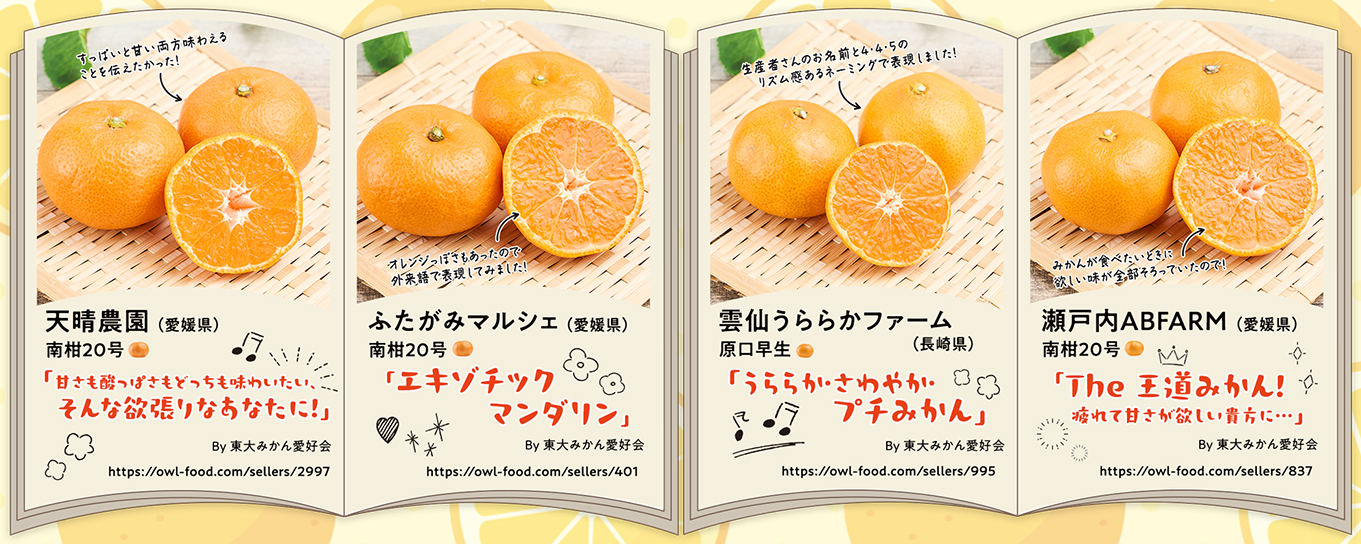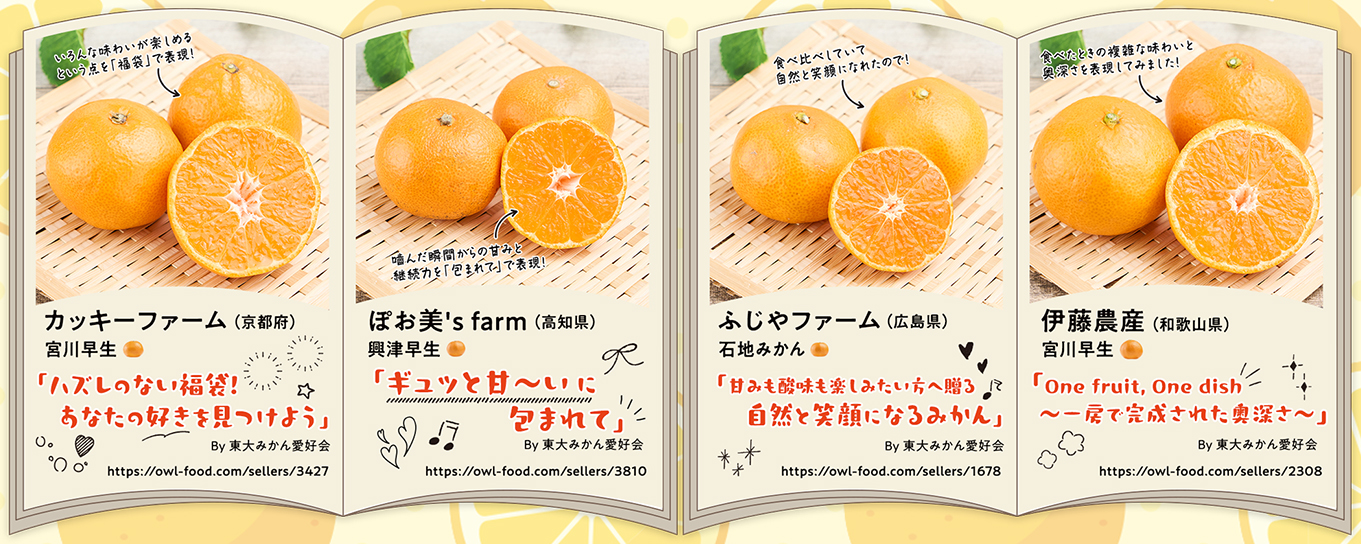 今回の企画を通して、一口にみかんと言ってもその甘さ、香り、みずみずしさなどは作り手、産地によって少しずつ違うということを改めて勉強させていただきました。どのようなみかんがお好きな方でも、きっと美味しいと思っていただけるラインナップであると感じております。ぜひ皆様のお気に入りのみかんを見つけていただけたらと思います。