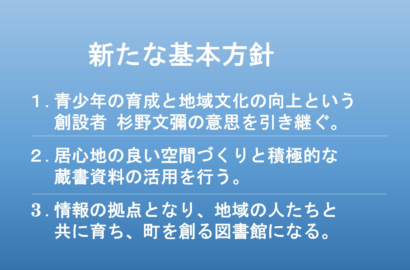 明治39年(1906年)に設置された現在の図書館は、県内最古の図書館であり、明治期の旧伊香郡の繁栄を、現在に伝える貴重な建物でもあります。ここを拠点に、地域の力で長年運営をされていることが今回の受賞につながったと聞き及んでおります。市立図書館と公立図書館の立場は違えど、「地域の青少年に図書を通じて知見を受け継ぎたい」という思いは、長浜市も同様です。