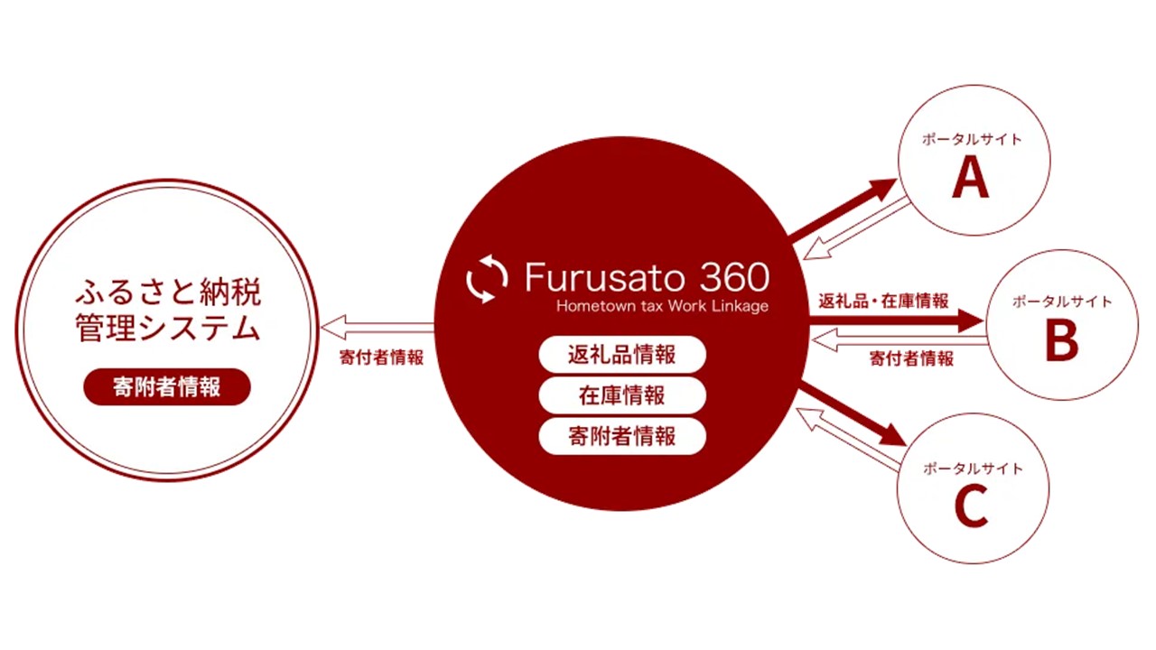 「Furusato360」は、返礼品情報・在庫情報・ 寄附者情報を一元管理し、複数のふるさと納税ポータルサイトに自動反映することで、ふるさと納税業務における運用管理の手間や時間を簡略化できる返礼品の一元管理のシステムです。地方自治体のふるさと納税担当者の業務を大幅に軽減し、効率化することができます。現在のご利用自治体数は全国約460となっています。