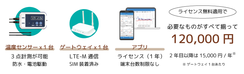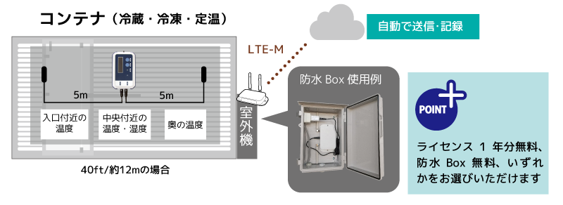 防水設計の温度センサーはコンテナ内にそのまま設置、無線でゲートウェイと通信します。ゲートウェイは防水Boxに入れることで、屋外コンテナへのあとづけも安心です。 本キャンペーンでは、ライセンス1年分無料と防水Box(通常30,000円税別)無料のいずれかをお選びいただけます。