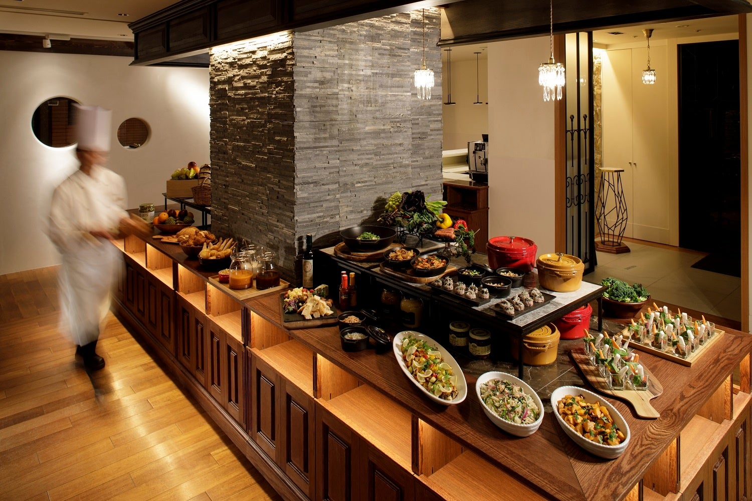 オールデイダイニング「シェフズ テラス」のランチブッフェでは、小さなお子様やご年配の方まで、老若男女どなた様でもおたのしみいただけるお料理を揃えました。定番のライブキッチンでシェフが目の前で切り分け提供するローストビーフや、パルメザンチーズの器で仕上げるリゾット、ティラミス・パンナコッタなどのデザートまで30種類以上のアイテムをぜひご堪能ください。