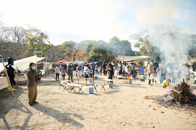 「あっ“たまる“比治山」は、10台以上もの焚き火を囲みながらくつろぐ、焚き火がメインのイベントです。そのため、比治山だけの特別ルールとして落葉拾いを実施。乾燥した落葉は、おいしい焼き芋づくりに欠かせない資材となります。普段から公園には清掃が入っているので、表向きは綺麗に見えますが落ち葉をめくるとペットボトルや缶などいろいろなごみが隠れています。それらを発掘しながらスポGOMIを楽しんでいただきました。