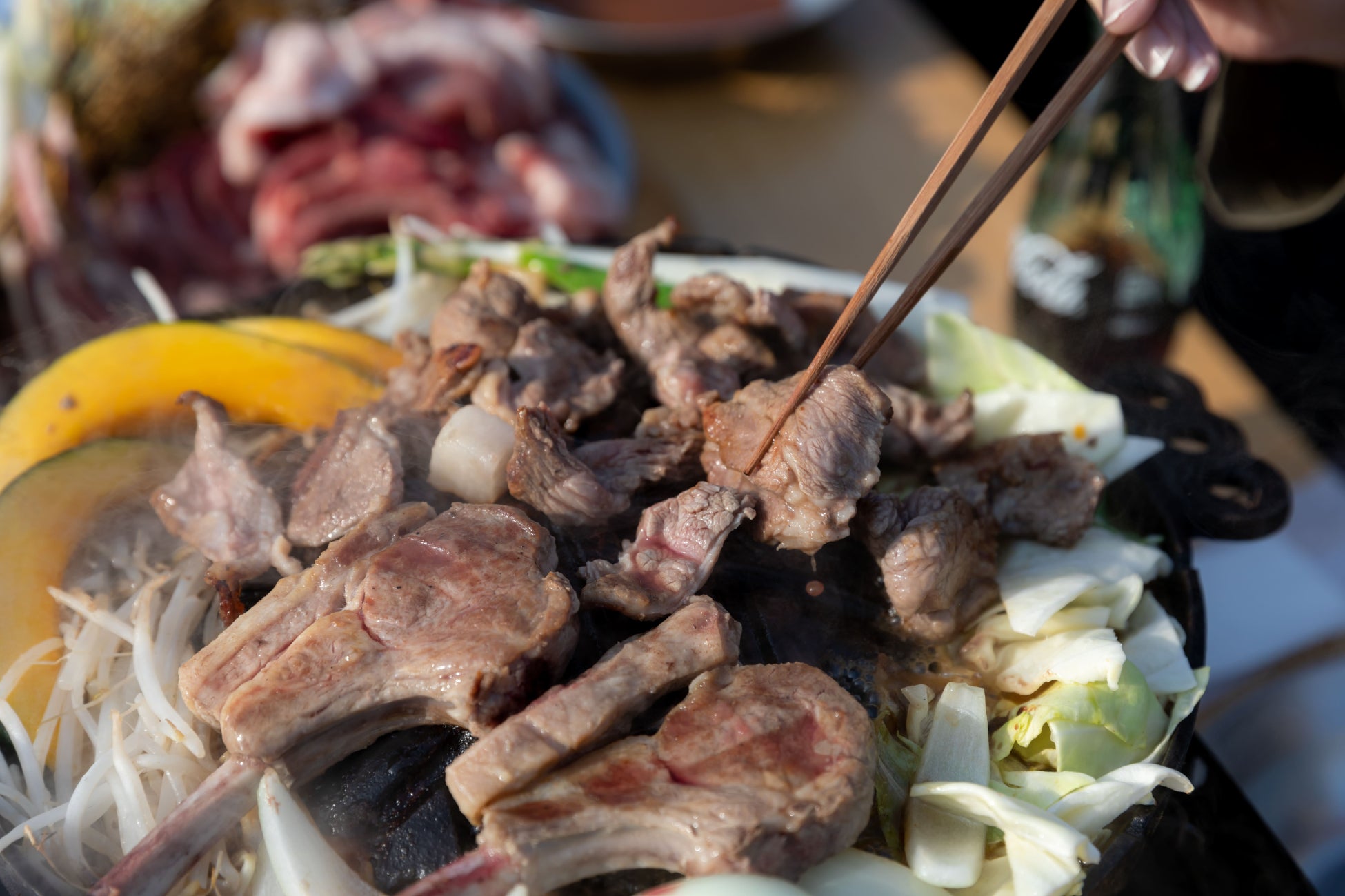石狩産望来豚バラ肉、中札内鶏もも肉、野菜、自家製ジンギスカンのタレ