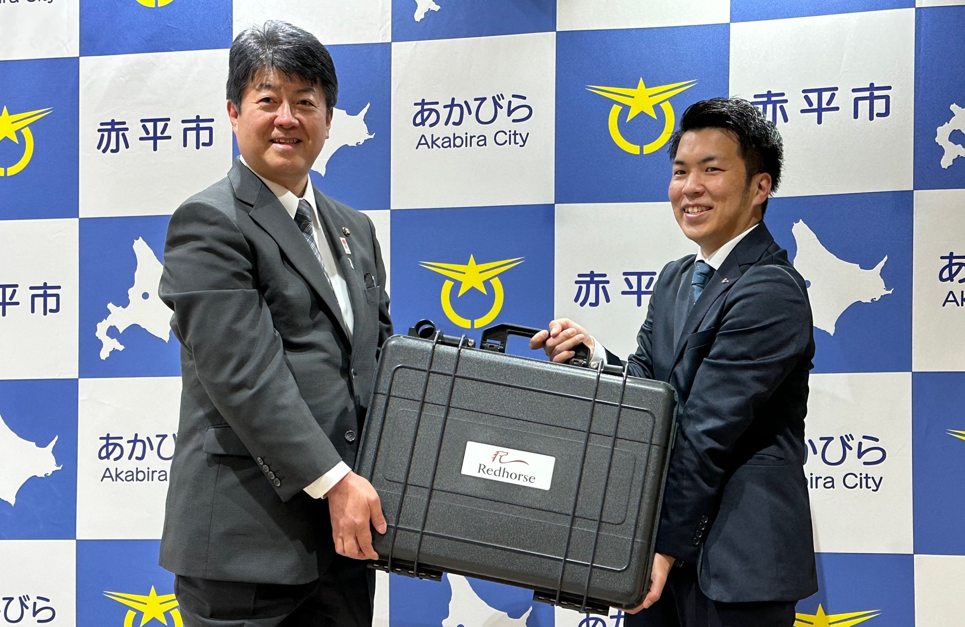 写真左から、赤平市畠山市長、レッドホースコーポレーション(株)中川