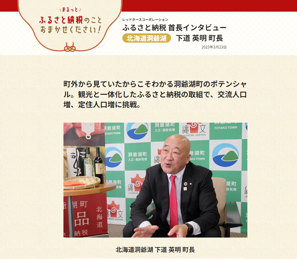 レッドホースコーポレーション株式会社(本社:東京都墨田区、代表執行役社長:山田 健介、以下 当社)は、平成28年度より当社が受託契約をしている北海道洞爺湖町(町長:下道 英明、以下 洞爺湖町)のふるさと納税事業を全面的にサポートしています。令和4年度の寄附額は前年対比120%の約1.7億円。さらなる寄附拡大のために昨年立ち上がった専門部署と連携し、今年度は2.3億円を目指して、タッグを強化いたします。今回は洞爺湖町の下道英明町長が、目標達成のための新たな返礼品の開発や寄せられた寄附を生かした子育て支援などについて「RHCふるさと納税首長インタビュー」で熱く語ります。