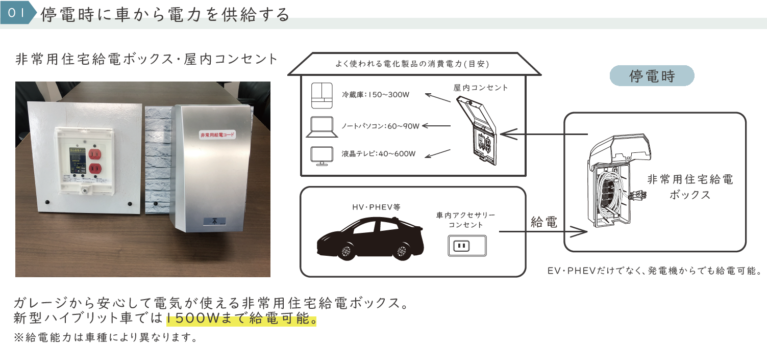 アイダ設計では、地震や台風など近年多発する自然災害等による停電などの非常時に、住まう人を守るべく、EV・PHEV車から電力を供給する為の「住宅用安心給電キット」と、EV・PHEV車を充電する専用コンセント(200V用)をセットにした新たなオプションパックをつくりました。「住宅用安心給電キット」は非常用住宅給電ボックスと屋内コンセントの構成で、停電時にはガレージに置いたEV・PHEV車内のアクセサリーコンセントに非常用給電コードを接続することで、専用屋内コンセントへ冷蔵庫やPC・テレビなど家電製品を接続し利用することが可能です。