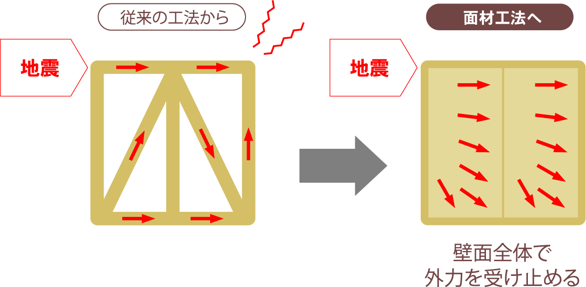 壁全体で地震力・風圧力を受け止め、集中してかかる力をバランスよく分散し、接合部への力の集中を緩和します。