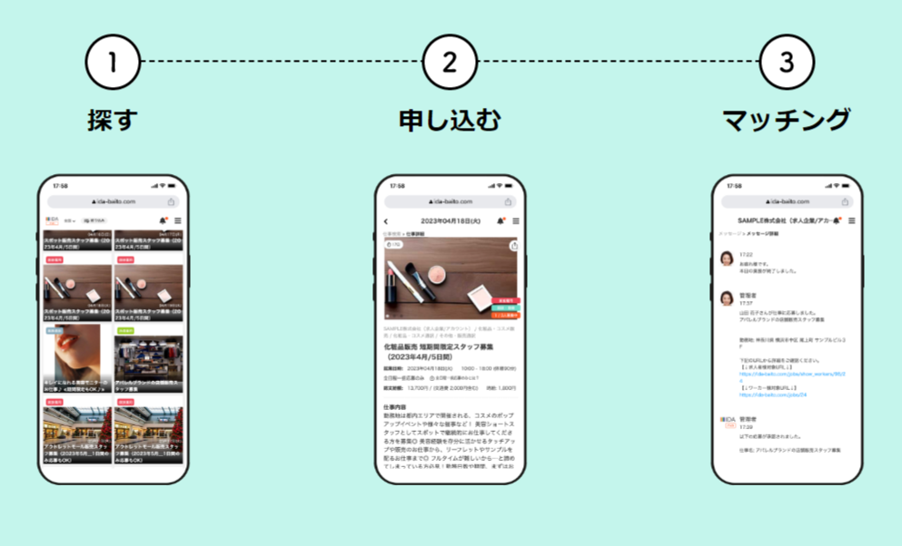 iDAは、ファッション・ビューティー業界に特化した最大の人材サービス会社として、「iDAバイト」を通じて多様な働き方と生涯キャリアのサポートを実現します。短期単発の仕事が増えるアフターコロナの時代においても、求職者と企業のニーズに応えられるプラットフォームを提供し続けることを目指しています。今後もiDAは、求職者と企業がよりフレキシブルにマッチングできるよう、サービスの改善と拡大に努めてまいります。