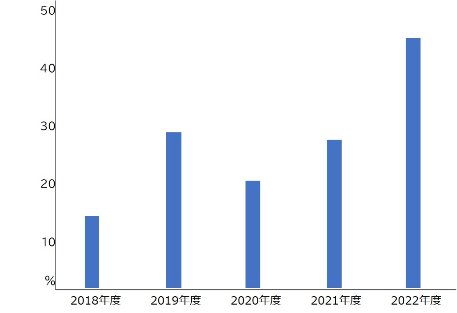 その結果、育児と介護に関わる社員のサポートを開始した2017年度に15.4%だった男性の育休取得率は、2019年度には28.6%、2020年度には20%、2021年度には27.3%と順調に増加傾向が見られ、2022年度は、44.4%と飛躍的に増加しました。また、昨年度の男性の育休取得社員の取得期間は、全員が3か月以上と長期間の取得でした。なお、当社は2014年度、2017年度、2019年度の3度に渡り、「くるみん認定」の更新を受けており、2022年12月に初めて、「プラチナくるみん」の認定を受けています。