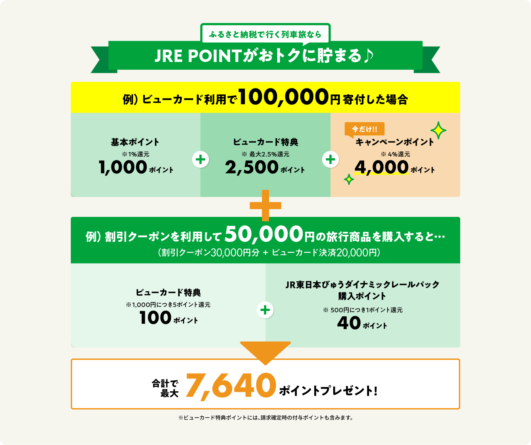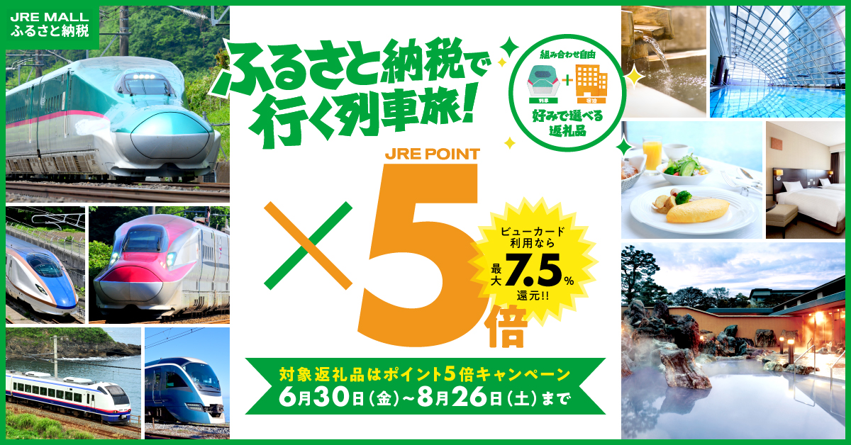 期間中、『ふるさと納税で行く列車旅』~JR東日本びゅうダイナミックレールパックで使える割引クーポン~の返礼品は、JRE POINT5%還元。ビューカード利用なら最大7.5%還元。